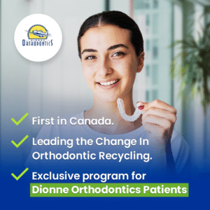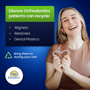 Dionne Orthodontics is proud to be the FIRST office in Canada to partner and sign the sustainability pledge alongside the Canadian and American Association of Orthodontists, helping lead the way in plastic recycling for aligners and other orthodontic and dental materials.